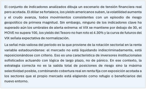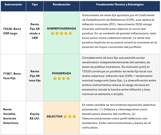 En el marco del análisis precedente, la estrategia de inversión recomendada se articula en torno a tres principios directores: (1) máxima selectividad en renta variable, priorizando los sectores con drivers independientes del conflicto o beneficiarios directos del mismo; (2) cobertura inflacionaria estructural en renta fija local, aprovechando el contexto de tasas reales positivas; y (3) precaución táctica en activos de alto beta hasta que los indicadores de volatilidad muestren señales sostenidas de normalización.