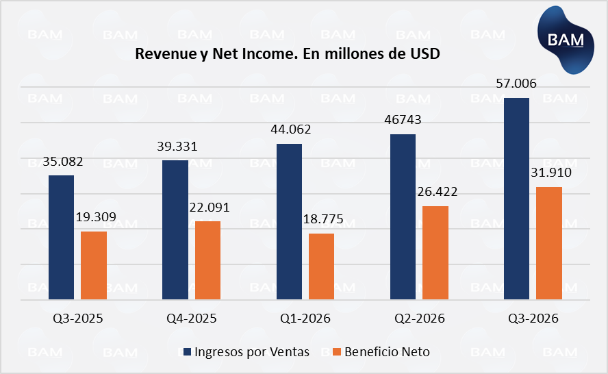 Tal como se observa en la evolución trimestral de ingresos, NVIDIA mantiene una trayectoria de crecimiento prácticamente ininterrumpida desde el Q3 FY25, pasando de US$ 35.082 millones a US$ 39.331 millones en Q4 FY25, US$ 44.062 millones en Q1 FY26, US$ 46.743 millones en Q2 FY26 y alcanzando el máximo histórico en Q3 FY26. Esta dinámica refleja no solo una expansión interanual significativa, sino también un fuerte crecimiento secuencial, con una suba del 22% respecto al trimestre previo, señal de que la demanda continúa superando las capacidades de oferta en segmentos clave.