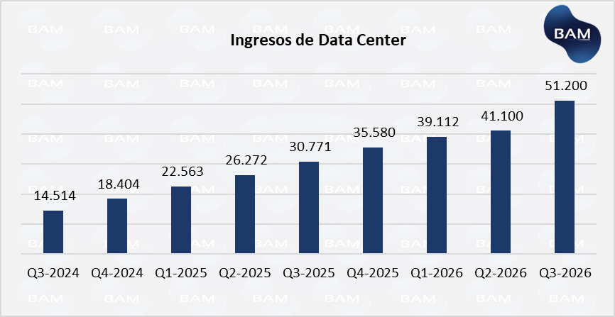 El segmento de Data Center continúa siendo el principal motor de crecimiento de NVIDIA. En el Q3 FY26, este negocio generó US$ 51.200 millones, con un crecimiento interanual del 66% y un incremento del 25% respecto al trimestre anterior, representando el 89% de los ingresos totales. La expansión está directamente vinculada a la fuerte demanda de GPUs para entrenamiento e inferencia de modelos de gran escala, la adopción progresiva de arquitecturas Blackwell, y el aumento del gasto de los principales hyperscalers y clientes corporativos en infraestructura de inteligencia artificial.