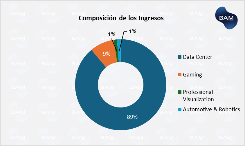 El negocio de NVIDIA se apoya principalmente en su segmento de Data Center, que concentra la mayor parte de los ingresos y márgenes, impulsado por la demanda estructural de aceleradores para entrenamiento e inferencia de modelos de gran escala. A ello se suman negocios complementarios de Gaming, Professional Visualization y Automotive & Robotics que, si bien tienen menor peso relativo, fortalecen la diversificación tecnológica y amplían el alcance de la compañía en distintas verticales de crecimiento de largo plazo.