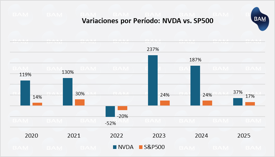Tras la corrección general del sector tecnológico en 2022, la acción inició una recuperación excepcional impulsada por la aceleración del gasto global en inteligencia artificial y la consolidación de su liderazgo en infraestructura de cómputo acelerado. En 2023 y 2024, NVIDIA exhibe retornos muy superiores al S&P 500, en un contexto en el que el mercado comienza a descontar un cambio estructural en el tamaño, la rentabilidad y el perfil de crecimiento del negocio, especialmente en el segmento de Data Center.