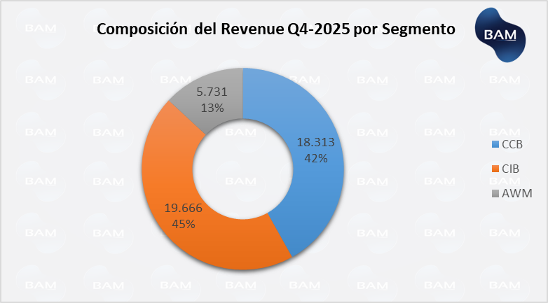 Por su parte, Consumer & Community Banking (CCB) mostró un desempeño estable, con ingresos sólidos impulsados por el consumo y el negocio de tarjetas, aunque con una presión gradual en indicadores de morosidad. El segmento registró US$3,6 bn de ganancia neta (US$5,3 bn ajustado), reflejando resiliencia del consumo estadounidense, pero también una transición hacia un entorno crediticio más exigente.