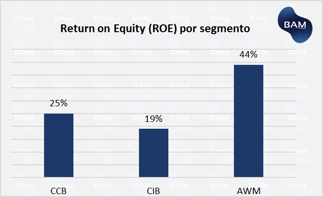 El segmento de Asset & Wealth Management (AWM) mantuvo una contribución estructuralmente positiva al resultado consolidado. Los activos bajo gestión crecieron aproximadamente 18% interanual, hasta US$4,8 tn, favorecidos por flujos netos positivos y revalorización de activos financieros. Este crecimiento fortaleció los ingresos por comisiones recurrentes.