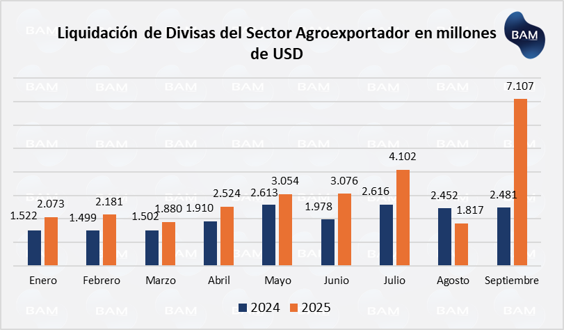 En 2025, el campo liquidó un total de US$27.815 millones, esto significa un acumulado del 50% por encima del mismo período que al año anterior. La liquidación de septiembre equivale a aproximadamente 3 meses. Por lo que en los siguientes meses se podría esperar una notable reducción de la liquidación del campo.