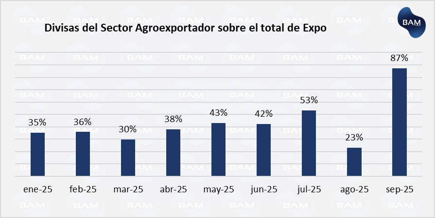 La liquidación de septiembre, alcanzó el 87% de las exportaciones totales. Y en el total acumulado de 2025, el campo pasó a representar el 44% del total acumulado de exportaciones.