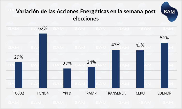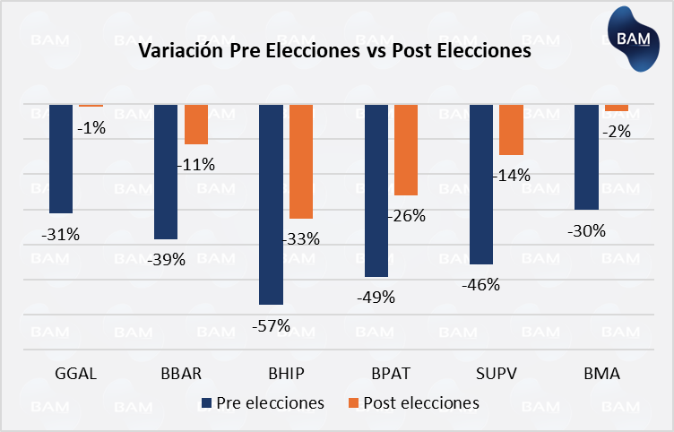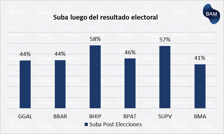 Luego de la victoria del oficialismo en las urnas el pasado 26 de octubre, las acciones argentinas retomaron nuevamente un rally alcista. Cabe señalar que los precios de las acciones cotizaban esperando un resultado adverso para el gobierno. Sin embargo, el error estuvo en nacionalizar una elección provincial, como fue la del 7 de septiembre en la Provincia de Buenos Aires.