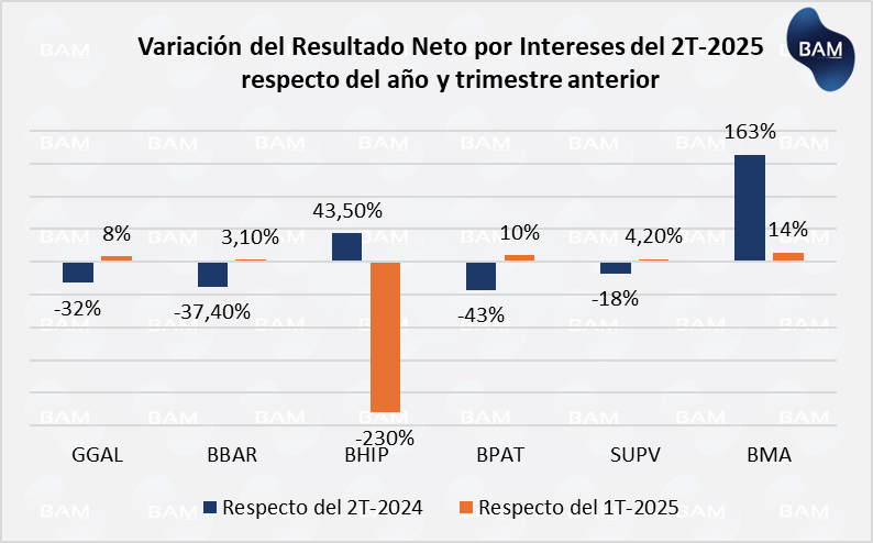 El primer punto de que los bancos vuelvan a ser bancos resalta el hecho de que obtengan ingresos por el spread de tasa activa y pasiva. Las entidades bancarias se vieron en el desafío de volver a funcionar como tales luego de la eliminación de leliqs y pases, donde sus ingresos por intereses cayeron notablemente. Lo cierto es que en los balances del 2T-2025, los bancos han experimentado una leve recuperación del resultado por intereses respecto del 1T-2025, con excepción del BHIP.