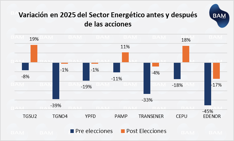 Se puede ver que, por ejemplo que Edenor acumulaba una caída del 45% antes del 26 de octubre. Luego del resultado, pudo recuperar gran parte de la caída y al día de la fecha acumula una caída del 17%. YPF y Edenor lograron recuperar casi toda su caída. Por su parte, TGSU2 era la empresa que menos caía en 2025 previo a las elecciones. La suba del 29% en la semana siguiente a las elecciones, hizo que actualmente suba un 19% en lo que va del año.