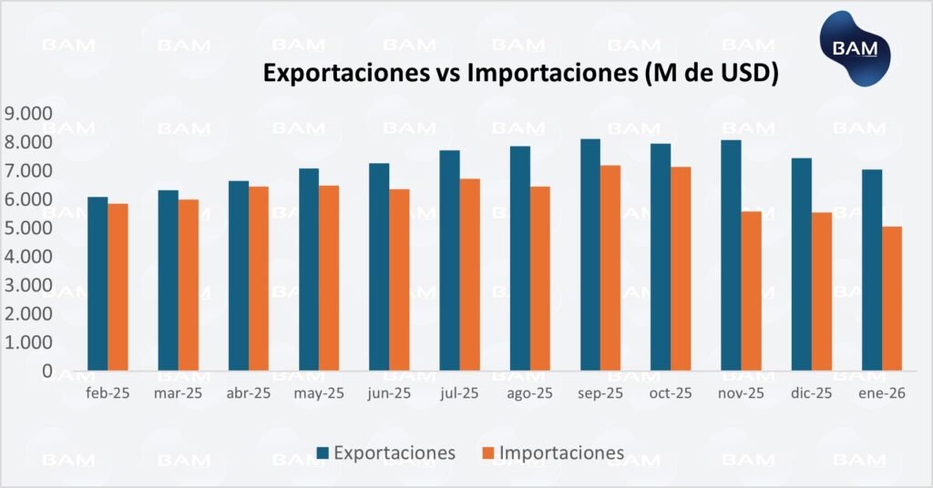El comercio exterior argentino inició 2026 con una mejora significativa del saldo comercial, reforzando transitoriamente la posición externa del país. En enero, las exportaciones alcanzaron US$7.057 millones, registrando un crecimiento de 19,3% interanual, mientras que las importaciones se ubicaron en US$5.070 millones, con una caída de 11,9% i.a. Como resultado, el saldo comercial registró un superávit de US$1.987 millones, muy superior al observado en enero de 2025, consolidando además 26 meses consecutivos de resultados positivos en la balanza de bienes.