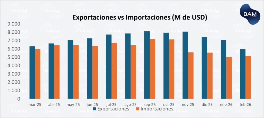 La mejora del saldo no responde a un dinamismo exportador particularmente robusto, sino principalmente a una fuerte compresión de las importaciones, consistente con el contexto macro que venimos analizando. La caída de compras externas está en línea con una economía doméstica debilitada: la industria continúa en contracción (EMAE manufacturero -2,6% i.a.), con niveles de utilización de capacidad instalada en torno al 53,6%, y sectores clave como automotriz y metalmecánica operando muy por debajo de sus niveles del año previo. En este contexto, la menor demanda de insumos importados, bienes intermedios y de capital explica gran parte del ajuste en importaciones.