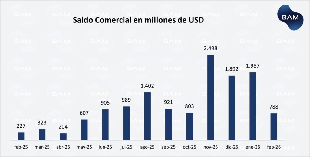 En febrero de 2026, el intercambio comercial argentino totalizó US$ 11.137 millones, con una caída interanual de -7,2%, reflejando una contracción tanto en exportaciones como en importaciones. Las exportaciones alcanzaron US$ 5.962 millones (-2,9% i.a.), mientras que las importaciones se ubicaron en US$ 5.174 millones (-11,8% i.a.), lo que dio lugar a un superávit comercial de US$ 788 millones, significativamente superior al registrado en igual mes del año anterior.