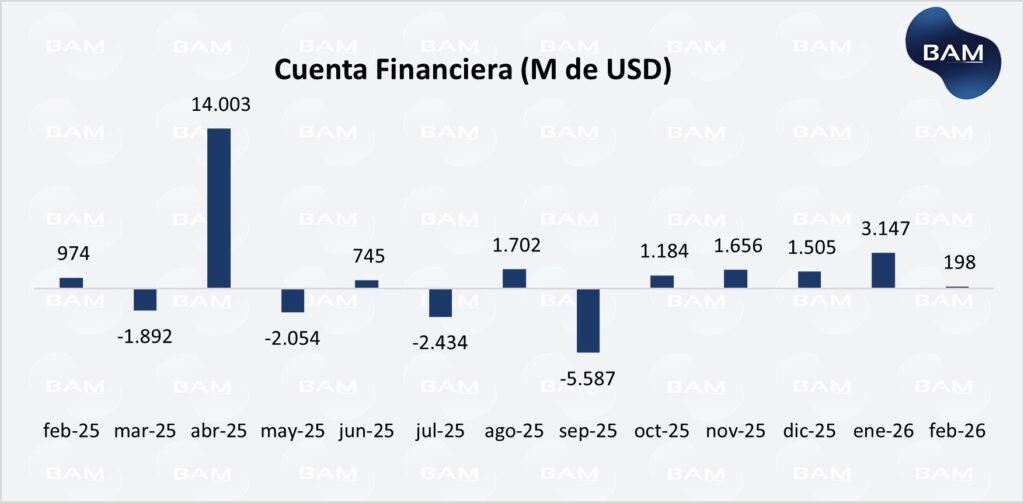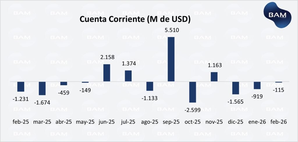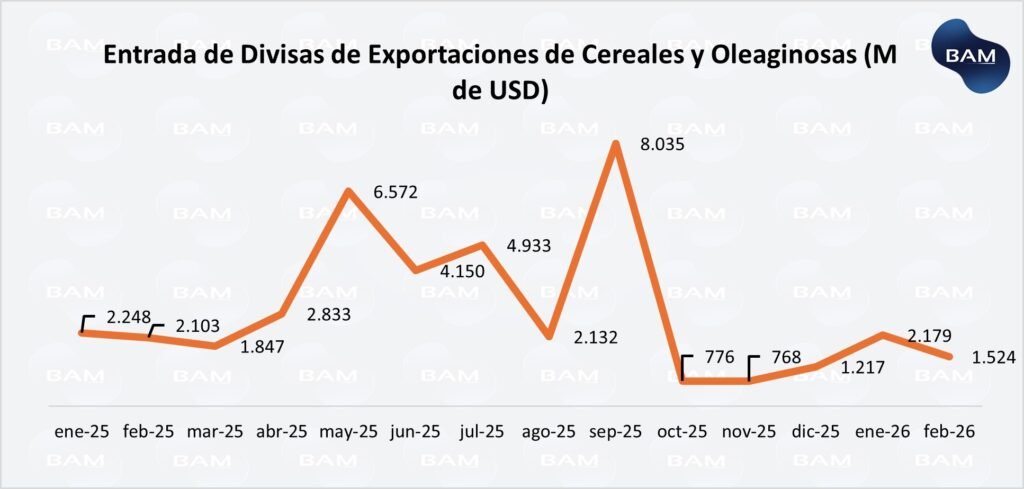 En este contexto, la cuenta corriente muestra una dinámica fuertemente condicionada por los sectores generadores de divisas. Por un lado, el sector energético evidencia una relativa estabilidad en los flujos, con ingresos mensuales que oscilan en torno a US$600 a US$1.000 millones, consolidándose como una fuente más predecible de oferta de dólares. Por otro lado, el complejo cerealero-oleaginoso presenta una dinámica mucho más volátil y estacional, con picos significativos asociados al ciclo de liquidación del agro. Tal como se observa en los datos recientes, los ingresos del sector agroexportador se mantienen contenidos en el inicio del año, lo que refuerza la expectativa de un salto en la oferta de divisas durante el segundo trimestre, en línea con la estacionalidad de la cosecha gruesa.