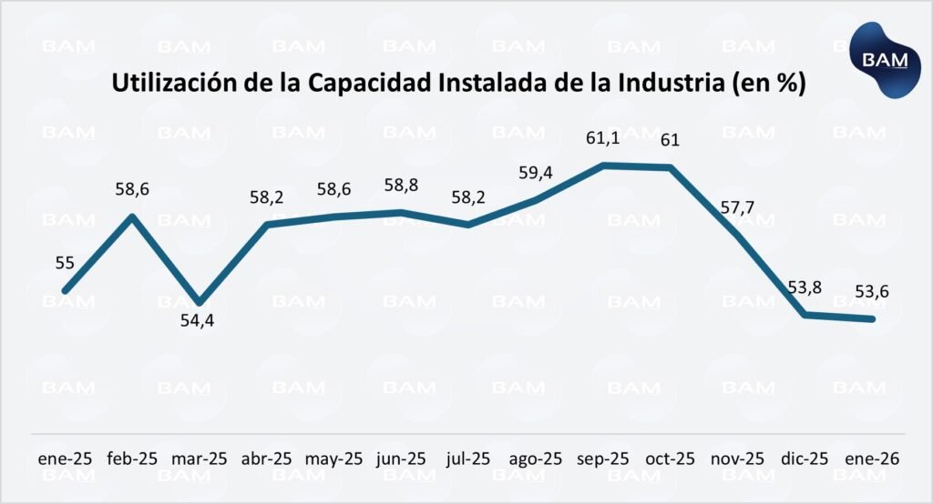 La evolución de la utilización de la capacidad instalada (UCII) refuerza la lectura de una economía con crecimiento agregado, pero sin tracción interna. En enero de 2026, la industria operó al 53,6% de su capacidad, por debajo del 55,0% registrado un año atrás, lo que indica que, a pesar del rebote del EMAE, el uso del capital productivo continúa en niveles bajos y en deterioro interanual.