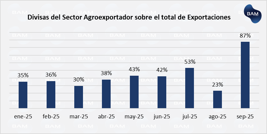 La liquidación de septiembre alcanzó el 87% de las exportaciones totales. Y en el total acumulado de 2025, el campo pasó a representar el 44% del total acumulado de exportaciones.