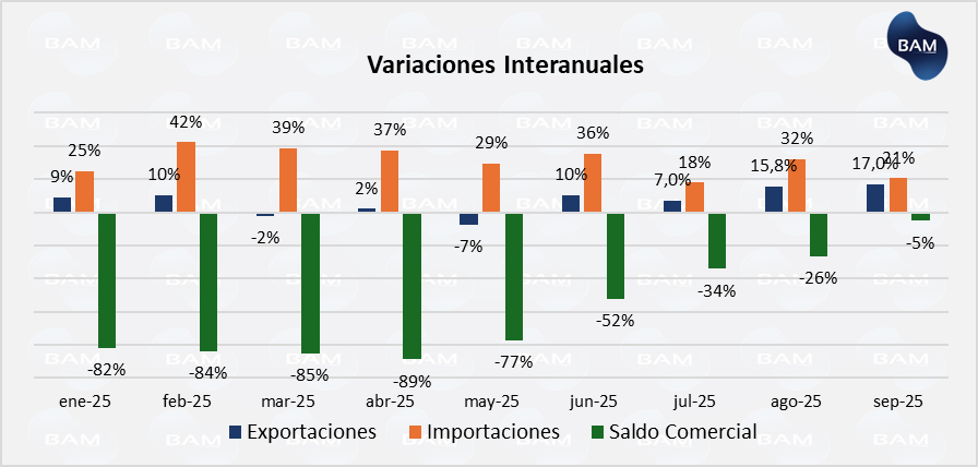El Intercambio Comercial Argentino para septiembre de 2025 registró un saldo positivo de US$921 millones en la balanza comercial, presentando una caída del 34% respecto del mes anterior y una caída del 5% interanual. Esto se explica por un incremento las importaciones (21% i.a) superior al incremento de exportaciones (17%).