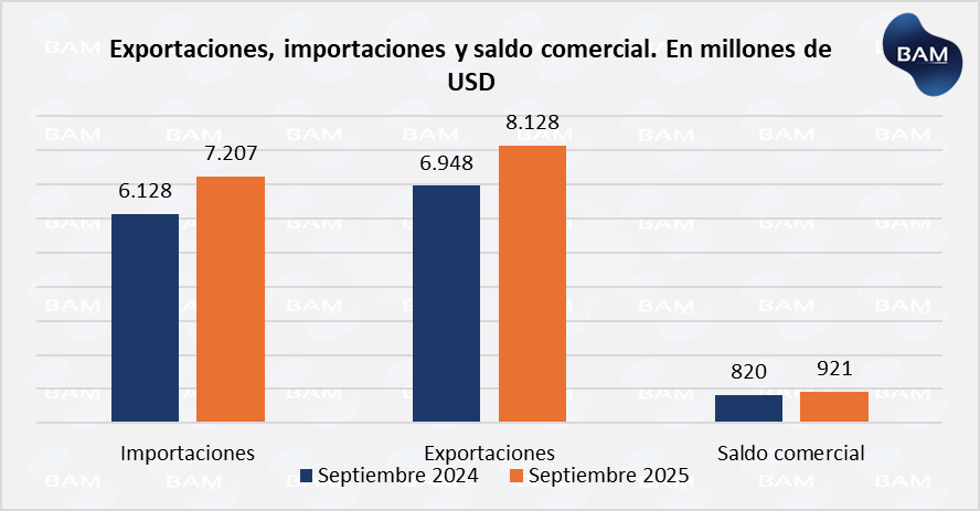 Las exportaciones sumaron US$8.128 M, lo que representa un aumento del 3,3% respecto del mes anterior y una suba del 17% respecto de septiembre de 2024. El aumento de las exportaciones se explica por un incremento del 16,5% en cantidades, mientras que por debajo del 0,5% es explicado por aumento en precios.
