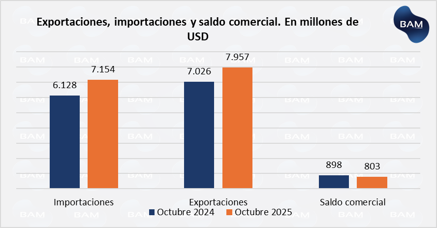 El Intercambio Comercial Argentino para octubre de 2025 registró un saldo positivo de US$803 millones en la balanza comercial, presentando una caída del 13% respecto del mes anterior y una caída del 11% interanual. Esto se explica por un incremento de las importaciones (17% i.a) superior al incremento de exportaciones (13%).
