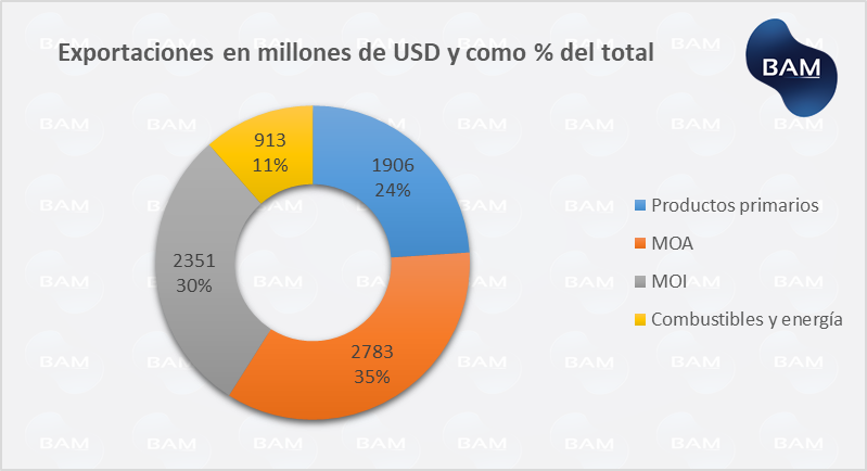 Las exportaciones argentinas continúan mostrando una alta concentración en el complejo agroindustrial. Las manufacturas de origen agropecuario (MOA) explican el 35% del total, seguidas por las manufacturas de origen industrial (MOI) con el 30%, reflejando el aporte de sectores como el automotriz y la industria química. Los productos primarios representan el 24%, evidenciando el peso del agro en estado más básico, mientras que combustibles y energía alcanzan el 11%, consolidando el avance del sector energético como fuente estructural de divisas. En conjunto, esta composición confirma que el saldo externo argentino depende centralmente del agro y, en forma creciente, de la energía, mientras que la industria mantiene un rol relevante pero aún insuficiente para diversificar plenamente la canasta exportadora.