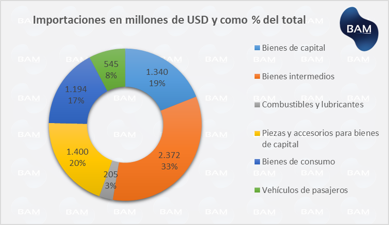 Las importaciones muestran una composición consistente con una economía en proceso de normalización. Los bienes intermedios concentran el mayor peso (33%), reflejando la dependencia de la producción local de insumos importados. Les siguen las piezas y accesorios para bienes de capital (20%; US$1.400 millones) y los bienes de capital (19%), señal de una recuperación gradual de la inversión y de la actividad industrial. Los bienes de consumo representan el 17%, mostrando una recomposición de la demanda interna, mientras que los vehículos de pasajeros explican el 8%. En contraste, combustibles y lubricantes tienen una participación reducida (3%), consistente con una menor necesidad de importaciones energéticas.