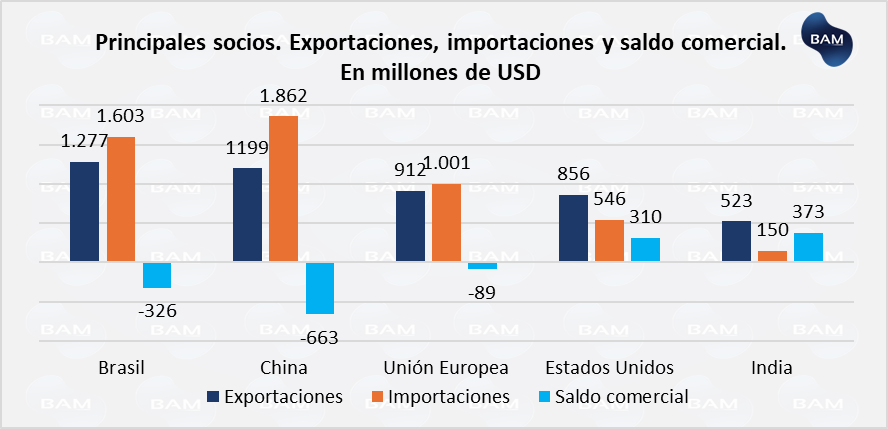 Brasil, China y Estados Unidos continúan siendo los principales socios comerciales de Argentina, concentrando una porción significativa del intercambio total. En exportaciones, Brasil se destaca por la fuerte participación de manufacturas de origen industrial (en particular del complejo automotriz), mientras que China y otros países asiáticos concentran compras de productos primarios y manufacturas de origen agropecuario. Estados Unidos, por su parte, presenta una canasta más diversificada, con peso creciente de combustibles y productos energéticos.