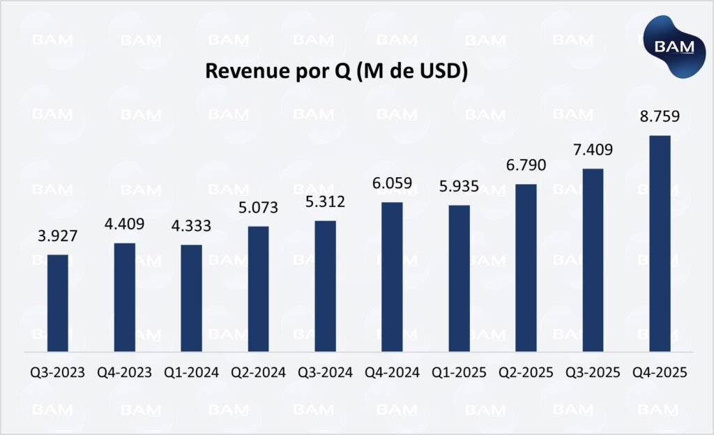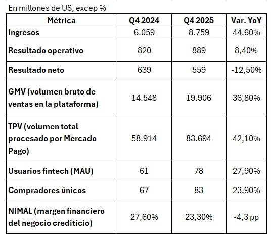 Mercado Libre reportó un sólido crecimiento en el cuarto trimestre de 2025, con ingresos que avanzaron un 44,6% interanual, impulsados por la expansión simultánea de sus dos motores principales: el negocio de comercio (GMV +36,8%) y el ecosistema fintech (TPV +42,1%). En términos operativos, la compañía mantiene una fuerte dinámica de crecimiento en volumen, con una base de usuarios en expansión tanto en e-commerce como en servicios financieros, lo que refuerza los efectos de red del modelo.