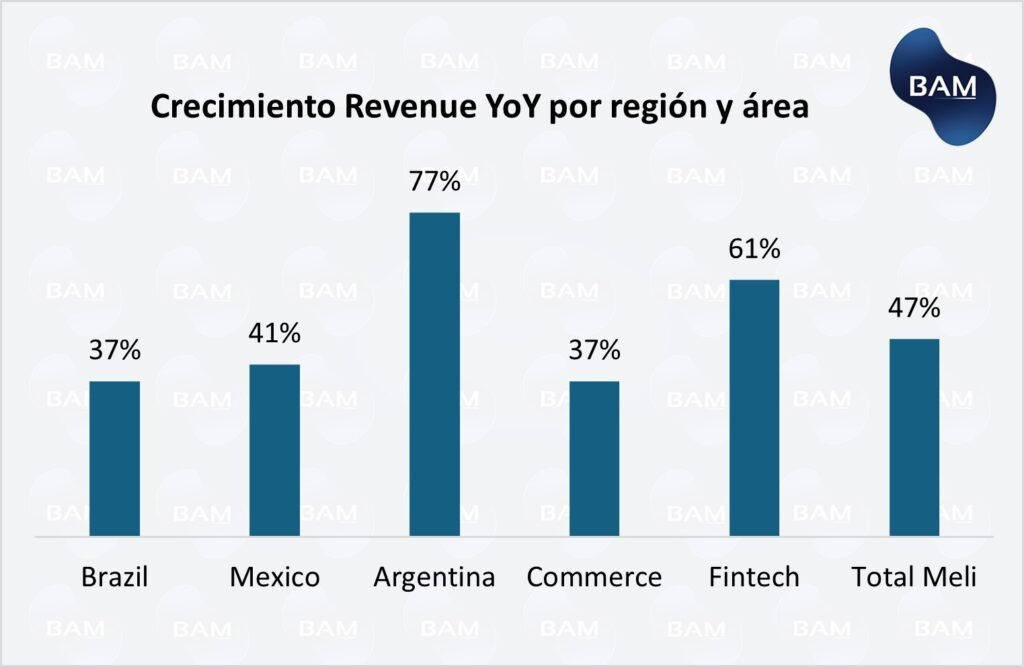 - Crecimiento sólido y diversificado: MELI mantiene expansión fuerte en e-commerce y fintech, con crecimiento real (ajustado por tipo de cambio) impulsado por volumen y usuarios.