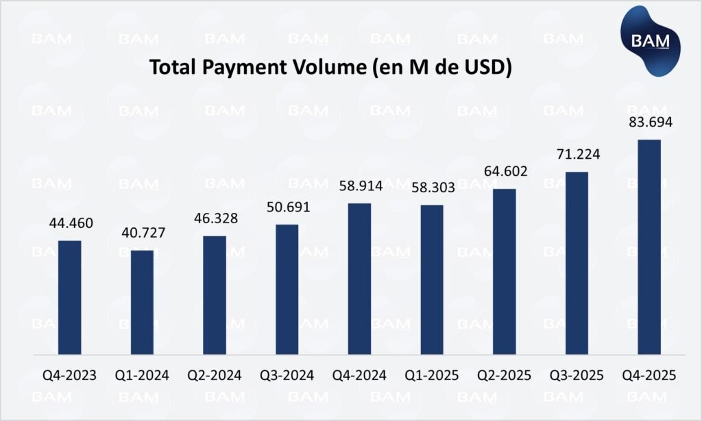 El TPV (volumen total procesado por Mercado Pago) creció +53% YoY (ajustado por tipo de cambio), acompañado por una expansión del 28% en usuarios fintech. El crecimiento se apoya en la mayor adopción de pagos digitales y en el posicionamiento de Mercado Pago como cuenta financiera principal.