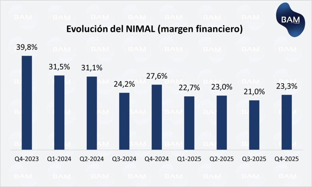 La cartera de crédito creció con fuerza (+90% YoY), impulsando consumo y monetización dentro del ecosistema. Sin embargo, el NIMAL (margen financiero ajustado por pérdidas) cayó a 23,3%, reflejando mayor exposición al riesgo crediticio.