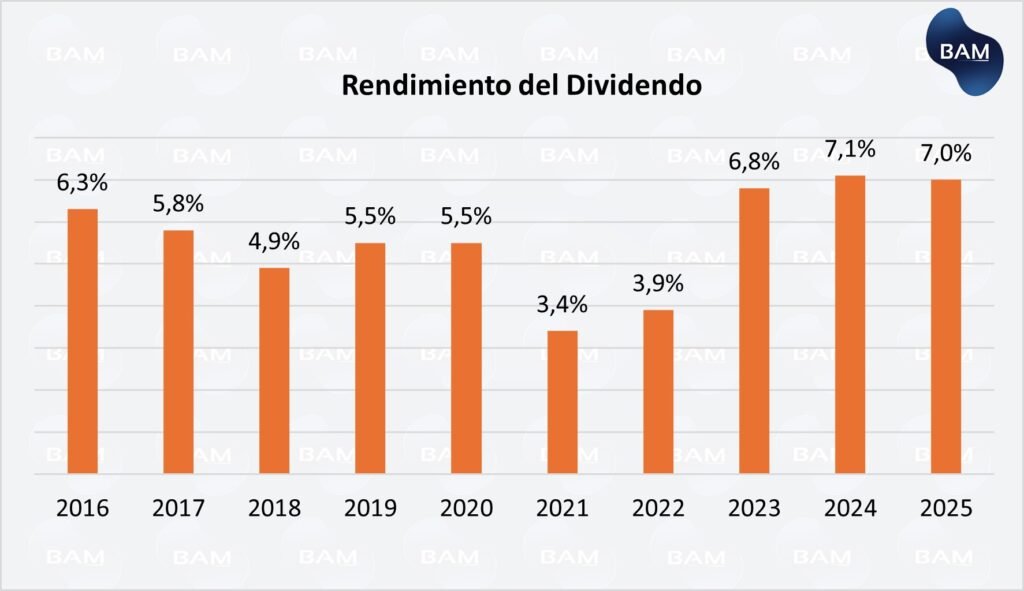 En el 2025 distribuyó un dividendo total de US$1,72 por acción, frente a US$1,68 en 2024, lo que representa un incremento interanual cercano al 2,4%. Si bien el crecimiento es moderado, la compañía ha sostenido aumentos incluso en un período de transición marcado por la normalización de ingresos post-pandemia.