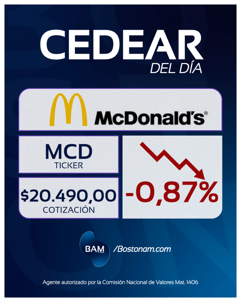 El CEDEAR cotiza a $20.490,00, presentando una variación negativa del -0,87%, respecto de la jornada anterior.